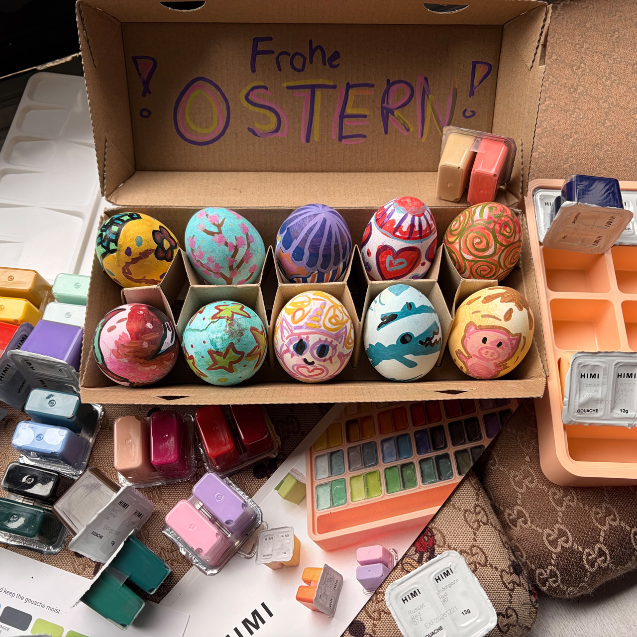 Die kräftigen Farben, die cremige Konsistenz und die hohe Deckkraft machen es besonders einfach, Ostereier individuell zu bemalen und einzigartige Designs zu erschaffen. Ob florale Muster, moderne Farbverläufe, verspielte Figuren oder kreative Kinderideen – mit HIMI Gouache sind der Fantasie keine Grenzen gesetzt.